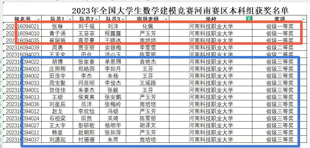 2023年全国大学生数学建模竞赛河南赛区本科组获奖名单公布,我校17项获奖,其中一等奖3项(指导老师:化佩、严玉芳、商培培),二等奖2项(指导老师:李雯雯、陈雪丽),三等奖12项(指导老师:袁艳杰、王芬、王瑶路、胡译文)。